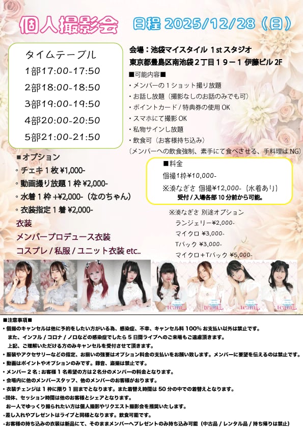 ・メンバー複数名同時撮影の際はメンバー分の料金にて可能です。